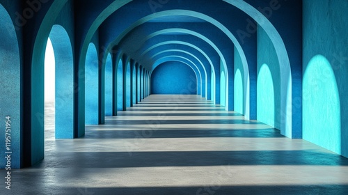 Fototapeta premium Blue Arched Corridor: A mesmerizing hallway of blue arches stretches...