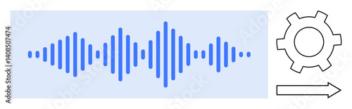 Obraz premium Blue audio waves signaling sound data, gear indicating processing or automation, arrow symbolizing forward motion. Ideal for technology, sound engineering, automation, innovation, communication