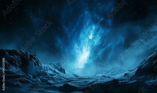 © Galina, Fototapeta premium Blue Aurora Borealis over Rugged Landscape. Majestic Northern Lights Background with copy-space.