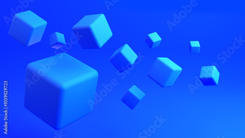 © Grispb, Obraz premium Blue background. Simple backdrop with cubes floating in air. Blue background for design. Texture on abstract theme. Pattern with geometric figure. Volumetric cubes on plain background. 3d image