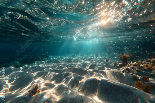 © Jack, Obraz premium blue background with deep underwater water in sea and sunbeams on surface with ripples