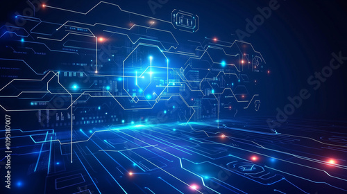 © Bruce, Obraz premium Blue background with glowing lines and blocks for technology concept vector presentation design template. Abstract blue gradient background vector illustration, high-resolution photography, in the sty