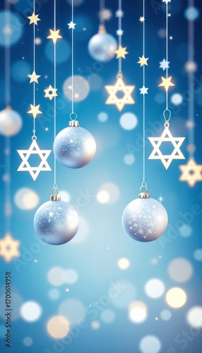 © Natalia, Fototapeta premium Blue background with hanging silver ornaments and stars. The scene evokes a festive atmosphere, suitable for holiday celebrations.