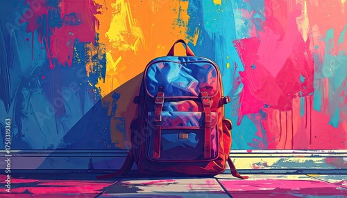 © StokGmail, Fototapeta premium Blue Backpack Against Vibrant Graffiti Wall