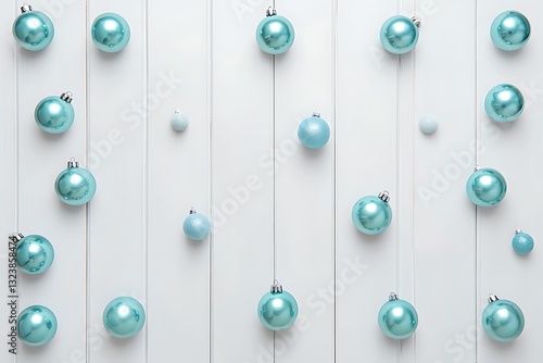 © Shahida, Obraz premium Blue balls hanging on white wooden wall background