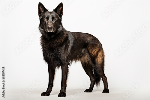 © Laser Eagle, Obraz premium Blue Bay Shepherd dog standing on a white background. Animal left-side portrait.