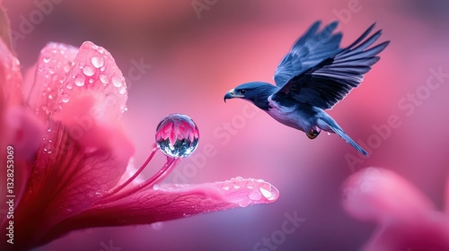 © Sippung, Fototapeta premium Blue bird flying near a pink flower with a large water droplet reflecting petals