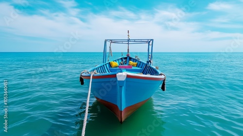 © A4719, Obraz premium Blue Boat Moored in Calm Turquoise Ocean Water Under a Sunny Sky