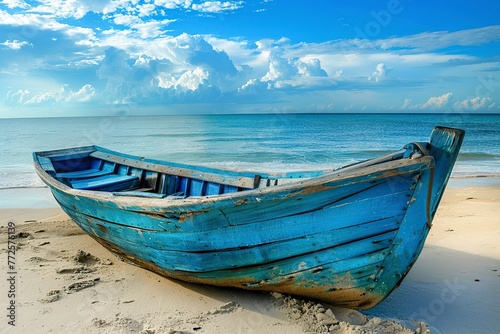 Naklejka premium Blue Boat Resting on Sandy Beach