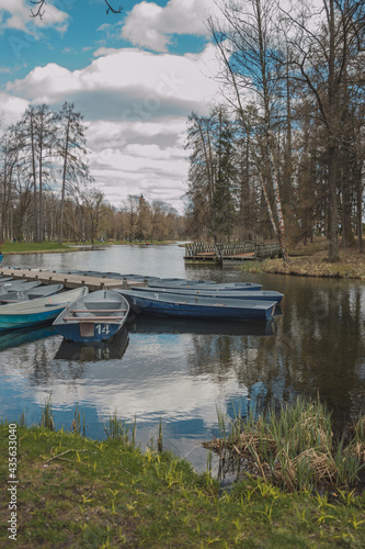 Fototapeta premium Blue boats on the river bank in Gatchina park