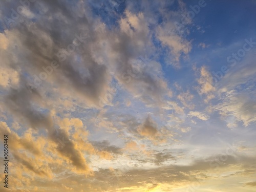 © Thinapob, Obraz premium blue bright and orange yellow dramatic sunset sky in countryside texture background.