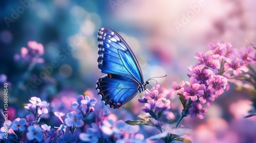 Naklejka premium Blue Butterfly on Flower Blooms in a Garden with Soft Light
