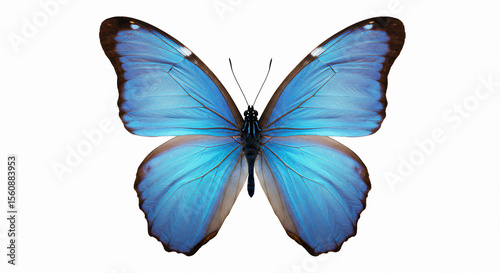 Fototapeta premium Blue butterfly with open wings on a white minimalist background, delicate insect illustration with fine wing details