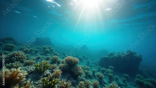 © Premium Illustration, Naklejka premium Blue Carbon. Sunlit underwater coral reef with vibrant marine life, scuba diving adventure, ocean exploration, tropical sea nature background, peaceful blue water environment ideal for travel or envi