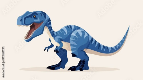 © PUTRI, Obraz premium Blue cartoon dinosaur with sharp teeth and claws roaring in front of an abstract background.