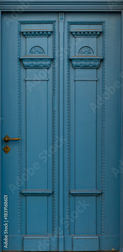Fototapeta premium Blue carved doors with historic ornament in city facade. Vintage blue doorway.