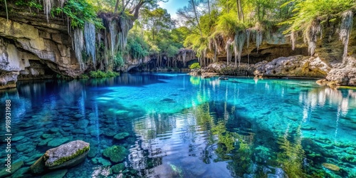 Naklejka premium Blue cenote interior with crystal clear water and natural rock formations,...