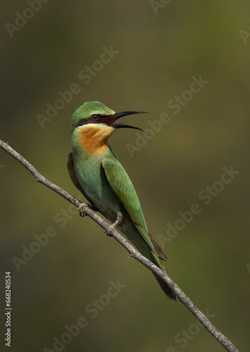 © Dr Ajay Kumar Singh, Obraz premium Blue-cheeked bee-eater perched on acacia tree with open mouth