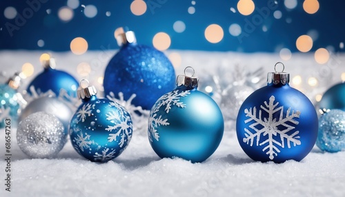 Fototapeta premium Blue christmas balls with snowflakes on bokeh background