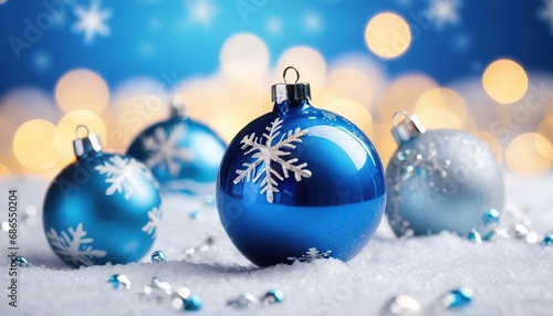 Fototapeta premium Blue christmas balls with snowflakes on bokeh background