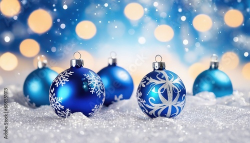 Fototapeta premium Blue christmas balls with snowflakes on bokeh background