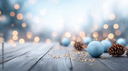 Fototapeta premium Blue Christmas ornaments and pine cones on wooden table with soft bokeh lights