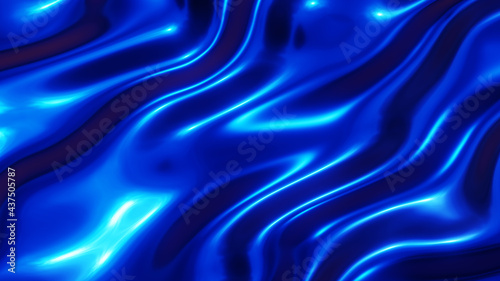 Obraz premium Blue chrome metal texture with waves, liquid metallic silk wavy design, 3D render illustration.