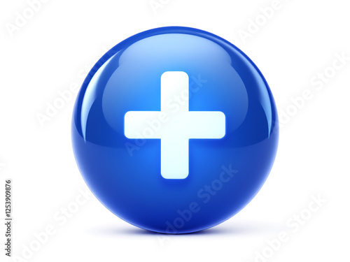 Fototapeta premium Blue circle and white plus symbol, 3D icon with isolated white background...