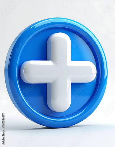 Obraz premium Blue circle icon with a rounded white plus sign in the center, isolated, glossy