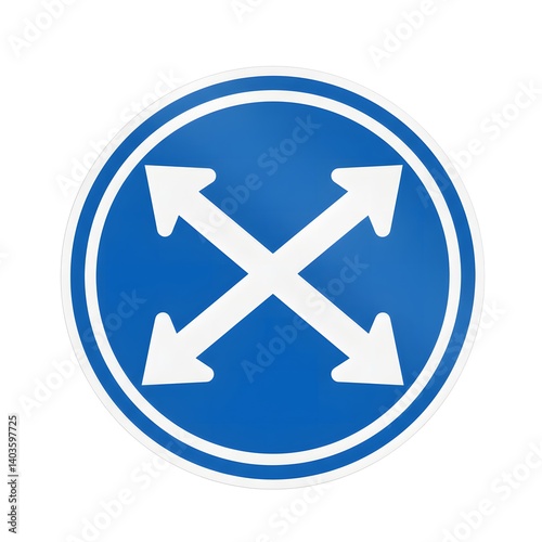 Fototapeta premium Blue circle sign with four white arrows pointing outwards