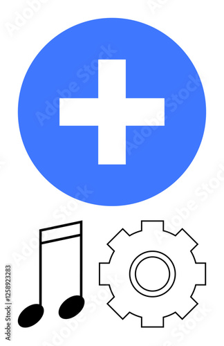 Fototapeta premium Blue circle with a white plus sign, black musical note, and gear outline....