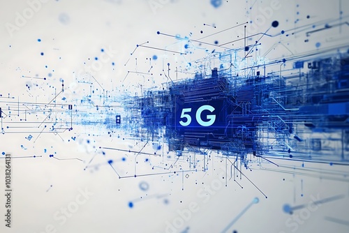 © Zheng, Obraz premium Blue Circuit Board with “5G” Text on a White Background, Featuring Abstract Blue Lines and Shapes in High-Resolution Vector Graphic Style