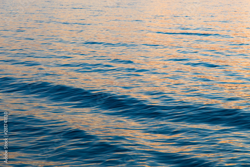 © Alwih, Naklejka premium Blue clear water. Beautiful blue sea wave photograph close up. Beach vacation at sea or ocean.