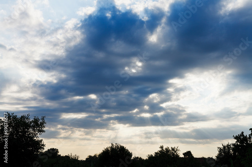 © vvoe, Fototapeta premium blue clouds over trees at sunset
