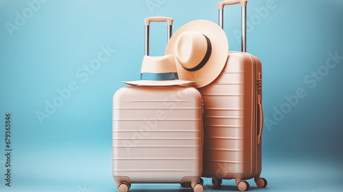 © alexkich, Obraz premium blue colorful travel bag with handle and straw hat isolated on blue