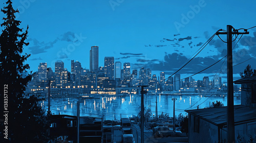© Almaz, Fototapeta premium Blue comic scene background with city silhouette