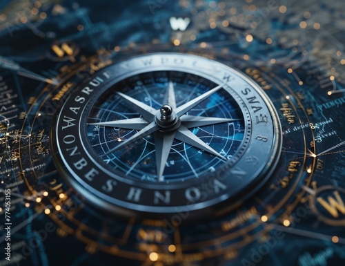 © FrankBoston, Fototapeta premium Blue compass rose on top of a map