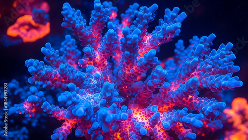 Fototapeta premium Blue coral with red glow in dark water showing underwater ocean marine