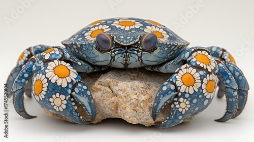 © mbakndut.std, Fototapeta premium Blue crab, floral design, on rock, closeup