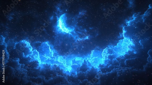 © afif, Fototapeta premium Blue crescent moon night sky cloudscape, cosmic background, fantasy art