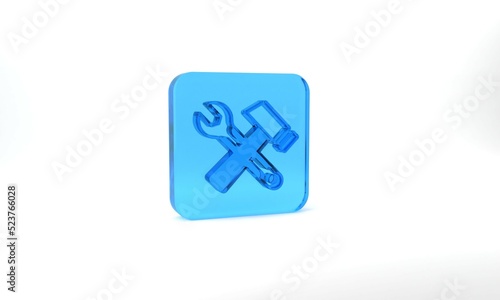 Obraz premium Blue Crossed hammer and wrench spanner icon isolated on grey background. Hardware tools. Glass square button. 3d illustration 3D render