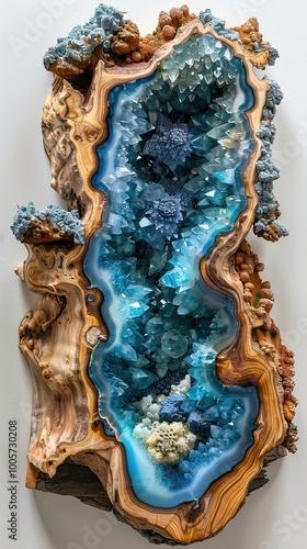 © Infinity, Fototapeta premium Blue Crystal Geode Embedded in Wood: A Stunning Natural Art Piece