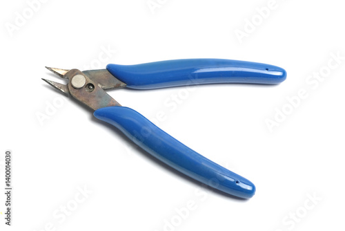 © Aditia, Obraz premium Blue cutting pliers for cutting wire, cable or plastic on isolated orange background, commonly used for cutting cables