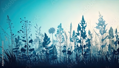 Naklejka premium Blue Cyanotype Style Garden Background with Wildflower and Plant Silhouettes