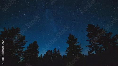 Fototapeta premium Blue dark night sky with many stars above field of trees