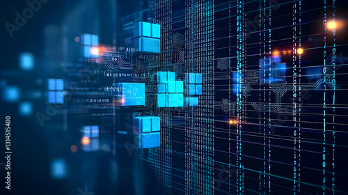 © artzone, Fototapeta premium Blue Data Stream With Glowing Cubes On Dark Digital Grid