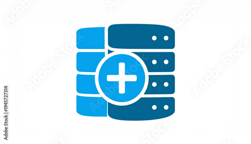 Obraz premium Blue database server stack with a bright blue plus symbol for adding data
