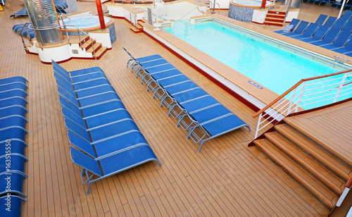 Fototapeta premium Blue Deck Chairs neatly placed on a Ship Deck