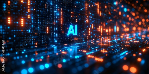 Obraz premium Blue digital background with the word "AI" in large letters centered,...