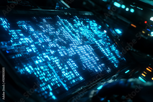 Obraz premium Blue digital binary data on a computer screen, creating a futuristic,...